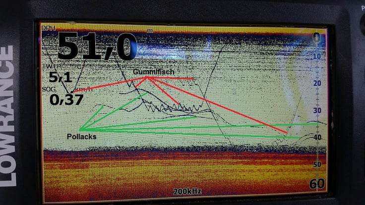 Manchmal sieht man sie aber und kann dann fast alles versuchen um sie ans Band zu kriegen. Sie zeigen den Stinkefinger, wie man eindrucksvoll auf dem Echoschirm entnehmen kann. Dies Bild ist von vorgestern und es wurde mit Gummifisch geangelt. Die Pollacks bissen nur mit laaaaangen Zähnen und knabberten nur am äusseren Ende des Tellers. Hätte man allerdings in dieser Situation jetzt auf Pose mit Makrelenfetzen umgebaut, dann hätte es sicherlich gekesselt. Eine kleine ganze Makrele an freier Schnur ohne Blei - nur mit einem 10/0 Haken langsam runtertaumeln lassen, wäre bestimmt auch nicht sooo schlecht. Auch ist es ein grosser Nachteil wenn das Echolot während des Angelns ON ist.