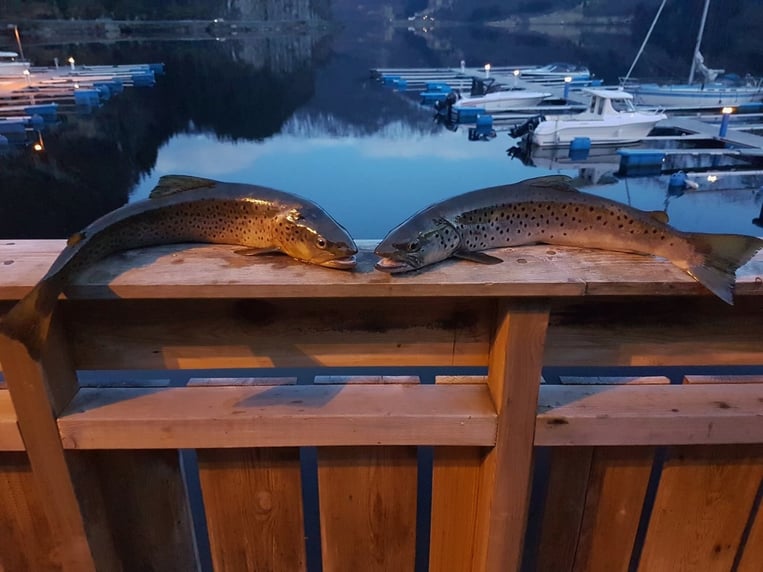 Salmoniden gab es nicht wenige in dieser Woche. Etliche Meerforellen täglich, wenn man gezielt drauf angelte. Aber in der Grösse eher als kleiner zu bezeichnen auch wenn welche bis 60cm darunter waren. Das Blinkern bringt dann auch schon mal den ein - oder anderen Lachs. Das Spinnern von den Bootstegen aus bringt fast immer Mefos. Spannend und erfolgreich ist auch das Angeln mit der Pose.