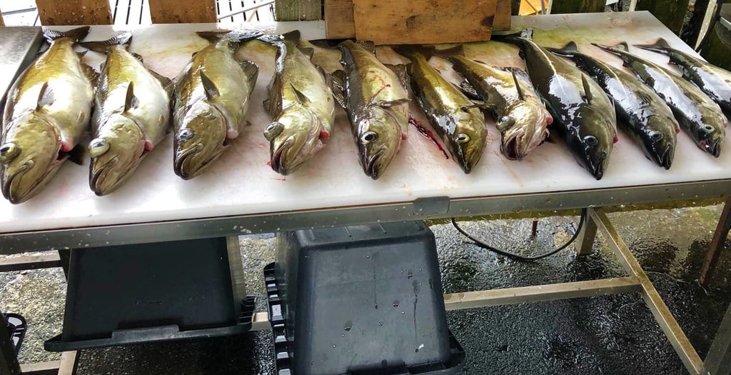 Auch wenn die Seehecht-Fänge deutlich unter dem Schnitt für September lagen, wurden an den meisten Tagen des Monats regelmässig welche gefangen wenngleich nur ganz wenige Grosse. In den zwei "schlimmsten Wochen" mit Klatschregen wie aus Eimern, starkem Wind und noch zusätzlich starke Strömung (als Sahnehäuptchen obendrauf) - ging "fischtechnisch" nur wenig.