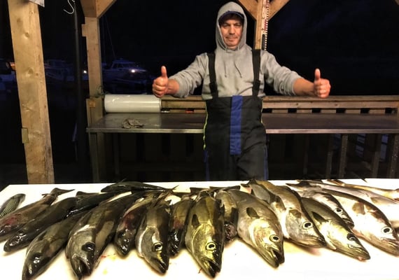 Stammgast Jens schlägt auch jedesmal zu und fängt gezielt Pollacks-Seehechte-Lachse.