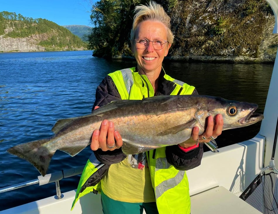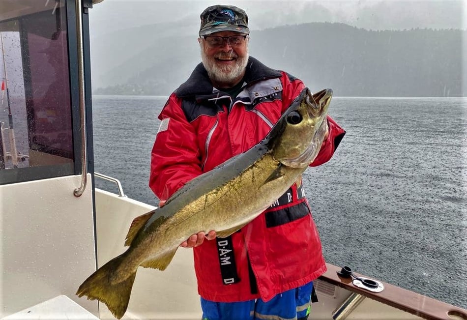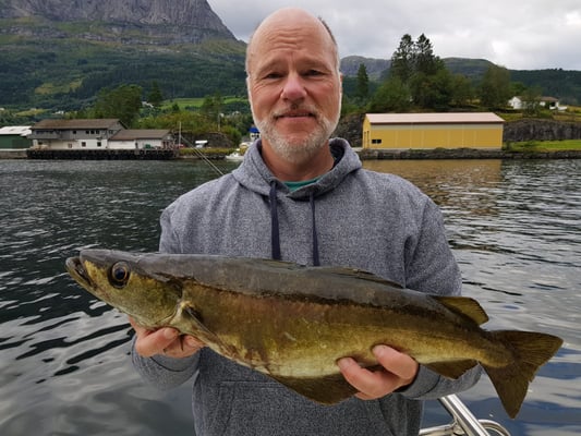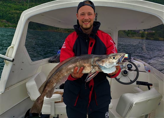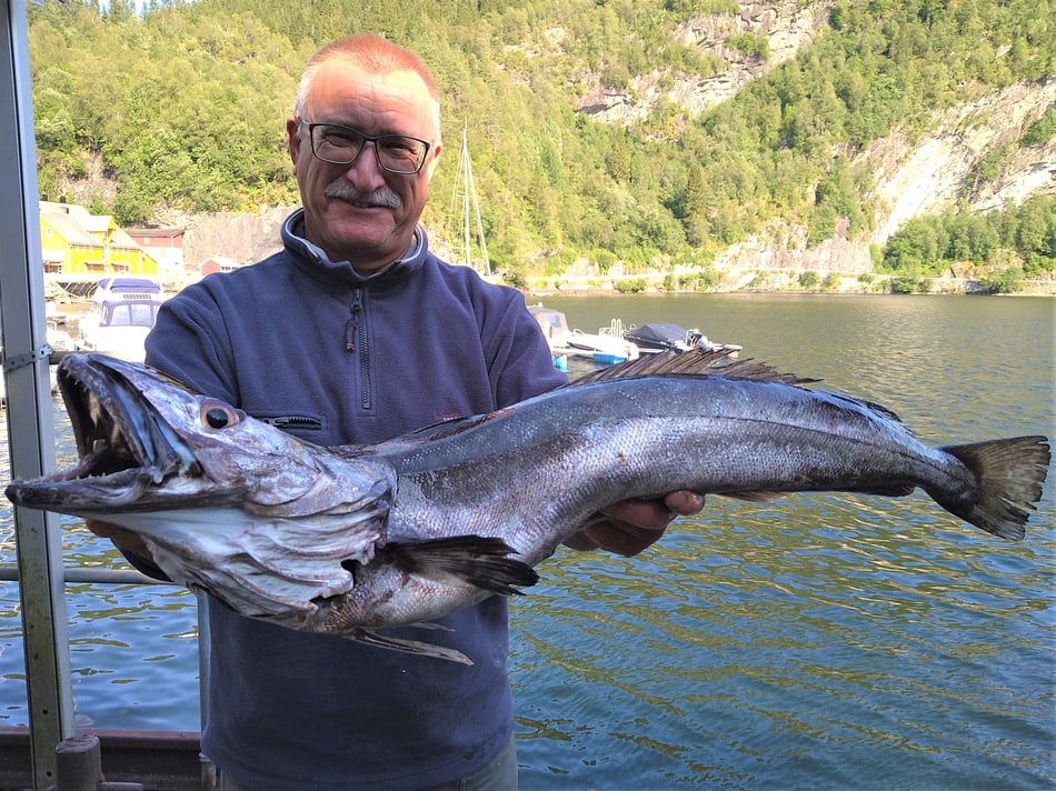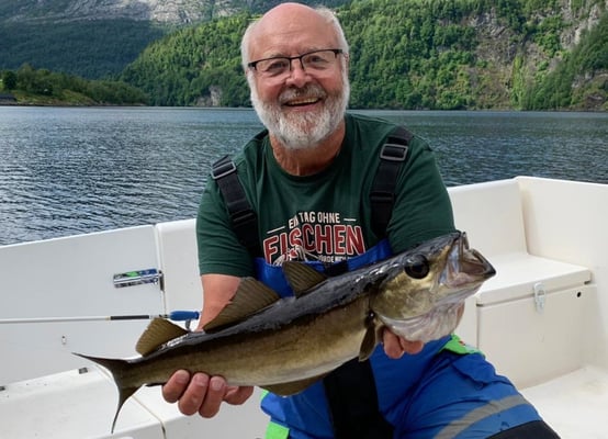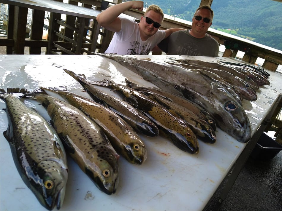 Nun . . . und das es hier keine Fische gibt, ist natürlich falsch denn gerade im hinteren Teil bei uns in Bygstad werden etwa 80% aller Fische von unseren Gästen gefangen. Die Fischgründe liegen hier bei uns fast direkt vor den Wohnungen und deshalb fahren nur wenige Angler weiter raus - und dann meist entweder zum Lengangeln im Tiefen oder zum Sightseeing - wohlwissend dass man je weiter man zum Meer fährt umso schlechter fängt. Aus diesem Grunde kommen viele Leute die ihr Ferienhaus am Meer oder in der Nähe des Meeres gebucht haben, zu uns um ein Boot zu mieten, damit sie überhaupt noch zu Fisch kommen.