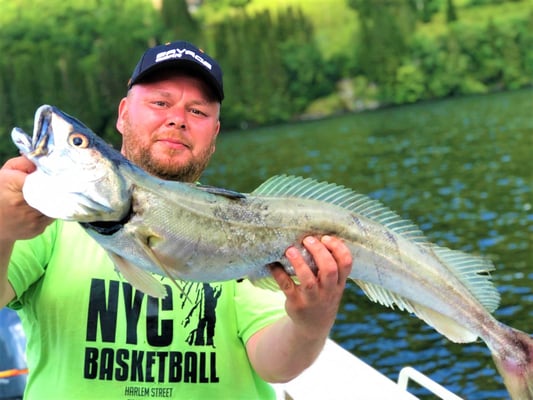 Thomas, seines Zeichens erfahrener Lachsangler hat sich diesmal auch mit den Wolfsbarschen angelegt und wie man sieht auch sehr erfolgreich. Dieser Bursche brachte es auf satte 4,5 kg.