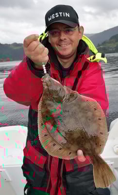 Stefan und zwei weitere Angler fingen Heilbutts auf Pilker mit Fischfetzen. Stefan verlor am nächsten Tag noch einen gewaltigen Heilbutt im Drill als der Haken aus dem Maul ausschlitzte. Sowas nimmt man aber als versierter Angler völlig gelassen . .